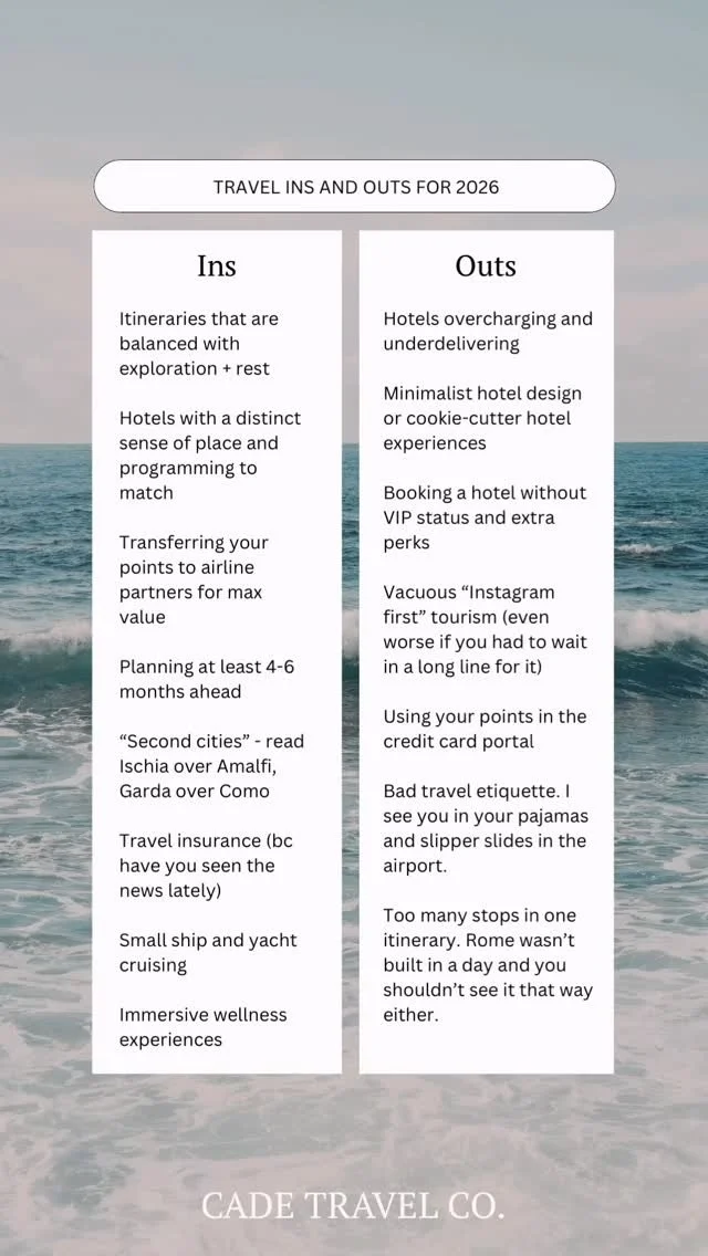 From effortless weekend escapes to immersive, multi-city itineraries, Cade Travel Co. curates distinctive accommodations and unforgettable moments that reflect your individual style and priorities. When you plan with me, every detail is considered—so you can experience each destination with clarity, confidence, and ease.